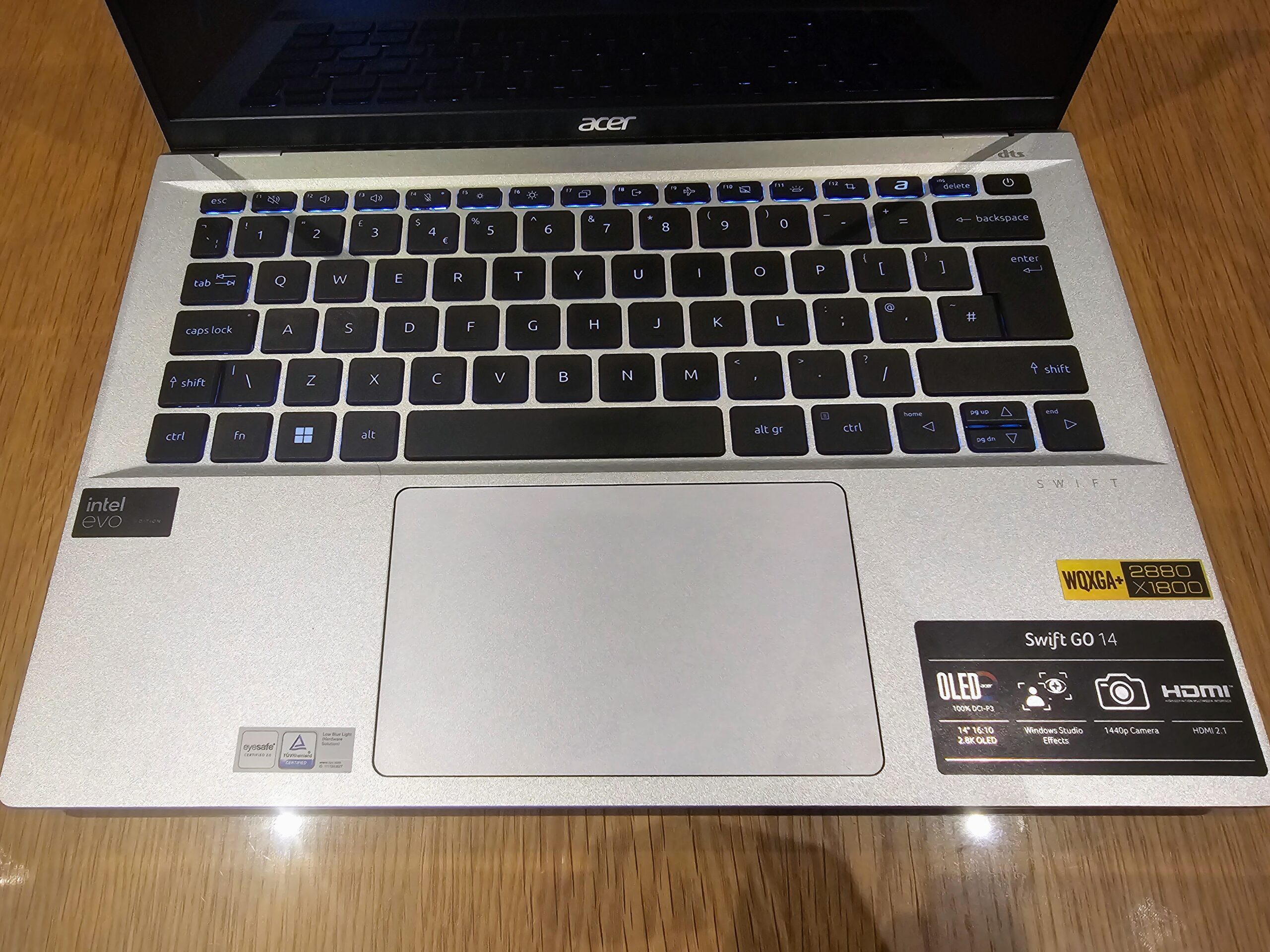 The Swift Go 14’s highlight is its gorgeous 14-inch 2.8K OLED display. The screen is incredibly sharp and immersive with a 2880×1800 resolution, 90Hz refresh rate, and 16:10 aspect ratio. It covers 100% of the sRGB colour gamut and 99% of the wider DCI-P3 gamut, making it suitable for colour-critical work. The 500-nit brightness is sufficient for most indoor environments.