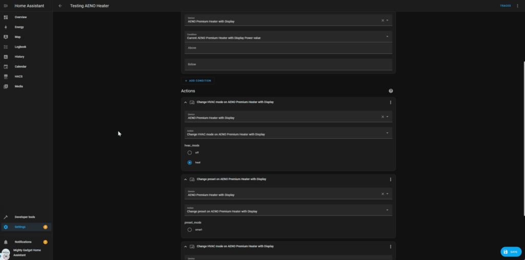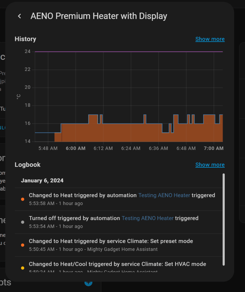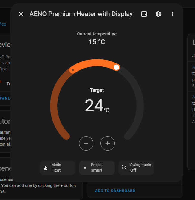 Once integrated, you can control the heater via Home Assistant with the option to switch it on/off, set the temperature and switch it to smart heating mode.