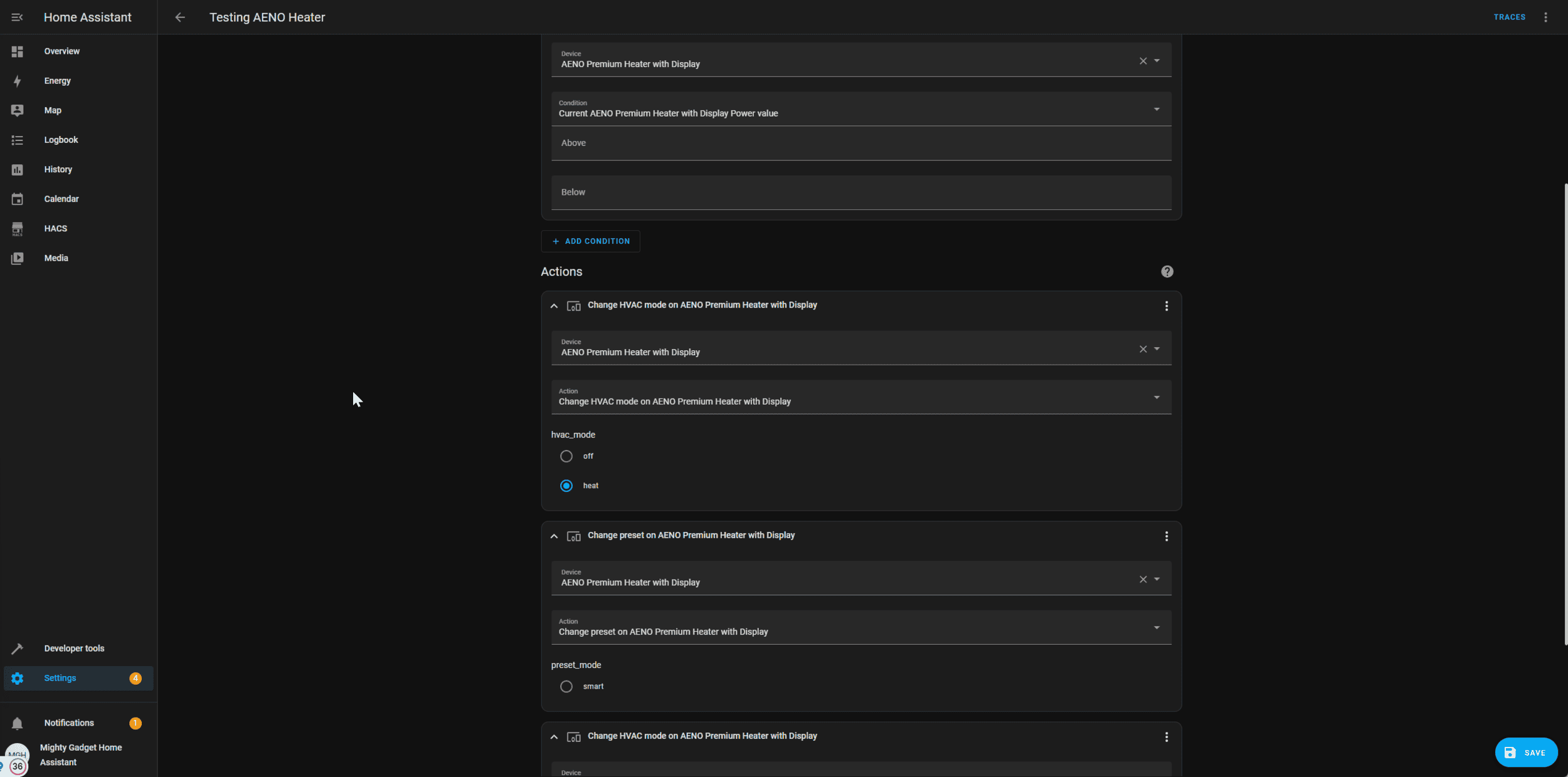 Under the automation features, you can toggle heating with the change HVAC option then select heat. You can switch it to smart heating with the change preset options, but there doesn’t seem to be a way to automate the temperature setting, it seems to select the temperature you had it on last.