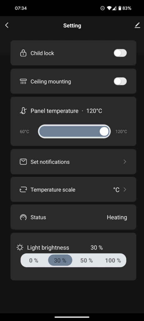It is also possible to dial down the panel temperature; this will, of course, result in slower heating, but also less power consumption. You have a range from 60-120 degrees. The lower temperatures are also useful if you have children or anything else that might accidentally touch the panel.