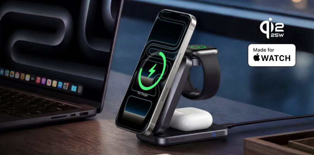The second product is the Anker Prime Wireless Charging Station, a foldable 3-in-1 wireless charger that can simultaneously charge an iPhone, Apple Watch, and AirPods. It uses Qi2 wireless charging at up to 25W for the phone, making it one of the faster wireless charging options currently available for iPhones. It also carries MFW (Made for Watch) certification for Apple Watch compatibility.