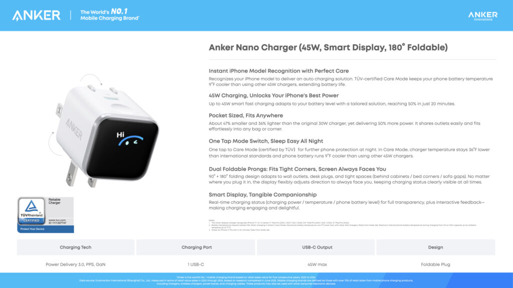 The Anker Nano Charger is a 45W USB-C wall charger that features a built-in smart display, making it the first charger of its kind to show real-time charging information directly on the unit itself. The display provides live readouts of charging power, temperature, and battery status, along with interactive visual feedback. Anker claims the charger can recognise supported iPhone and iPad models automatically and adjust its power delivery accordingly.