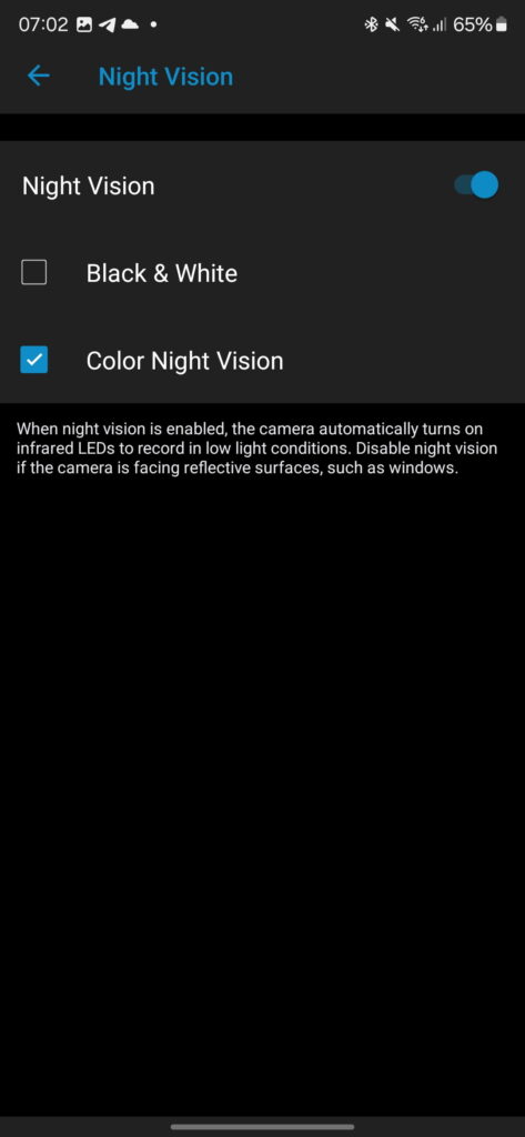 Like most/all other wire-free security cameras, the camera sensor is only capable of B&W footage at night but can achieve colour recordings with the help of the built-in spotlight. The up-and-coming Reolink Argus 4 Pro may be the first camera to achieve true colour night footage thanks to their ColorX technology.
