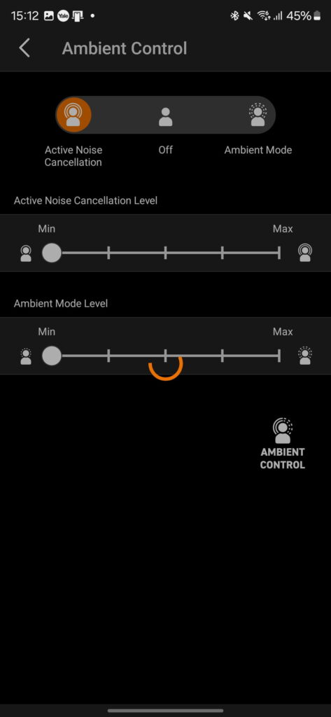 The earbuds also have an ambient mode that allows outside sound to pass through, useful for staying aware of your surroundings or having conversations without removing the earbuds.