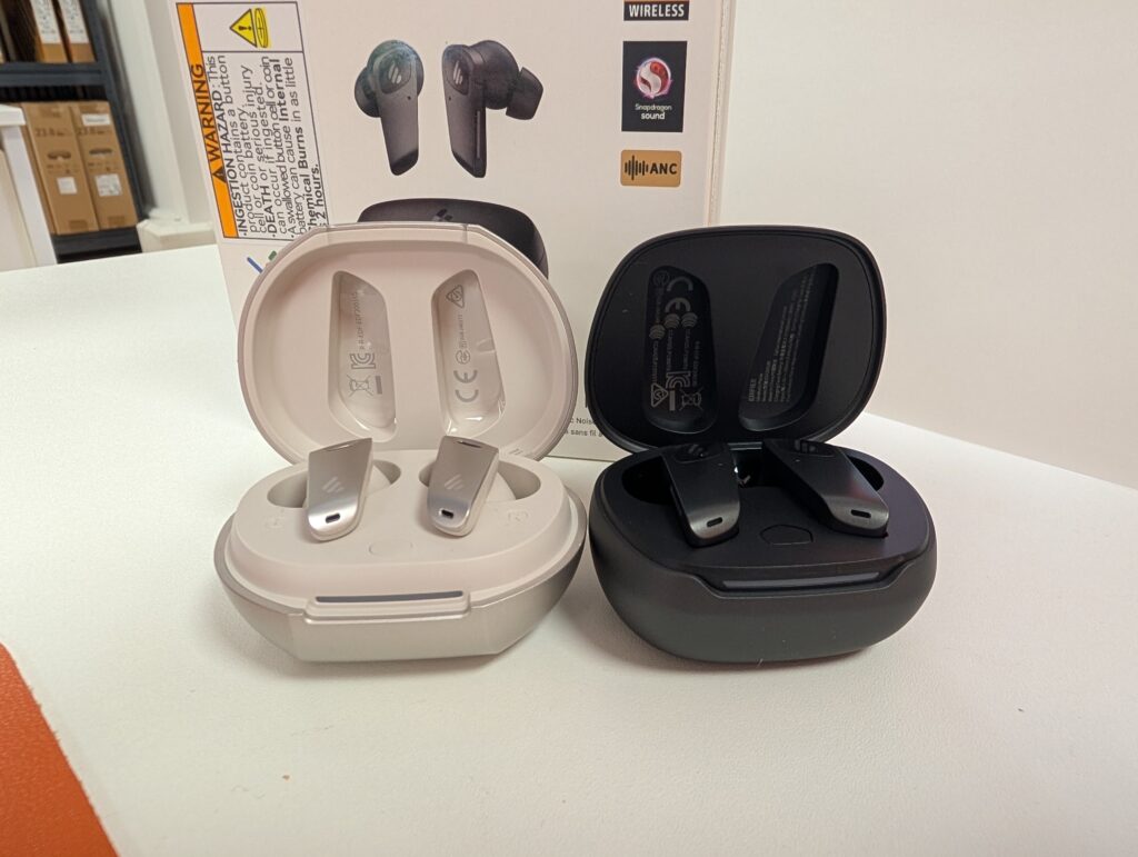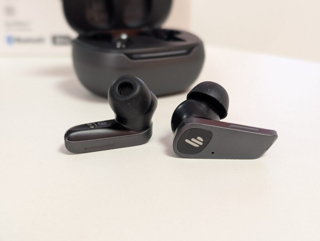The earbuds themselves have a somewhat angular appearance with a matte finish that resists fingerprints. Each earbud features a touch-sensitive panel with the Edifier logo, which handles various control functions.