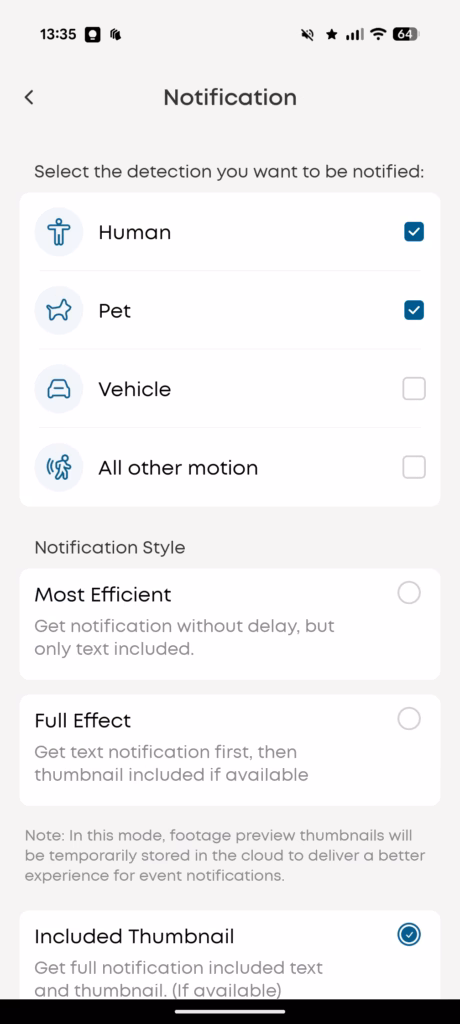 You can also customise notifications, such as what objects you get notified about, and whether it is a basic notification or one with a thumbnail.