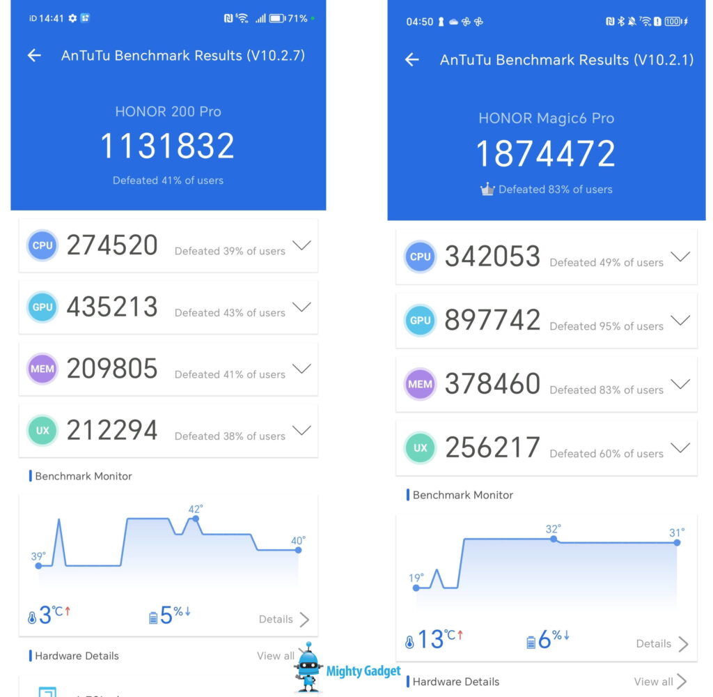 - Honor Magic6 Pro: 18160 high, 11867 low, 65.4% stability, 672mAh/12%pts