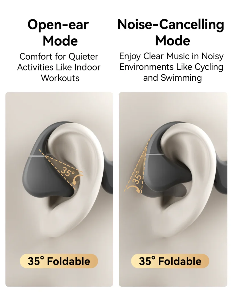 - Open-Ear & Noise-Cancelling Mode: The headphones feature 35-degree adjustable ear hook design, allowing users to switch between open-ear and noise-cancelling modes. This flexibility is particularly useful for adapting to different environments, from quiet indoor settings to noisy outdoor activities.