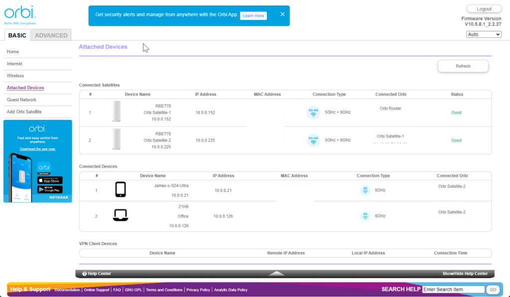 - Connected Devices: View and manage the devices connected to your Orbi