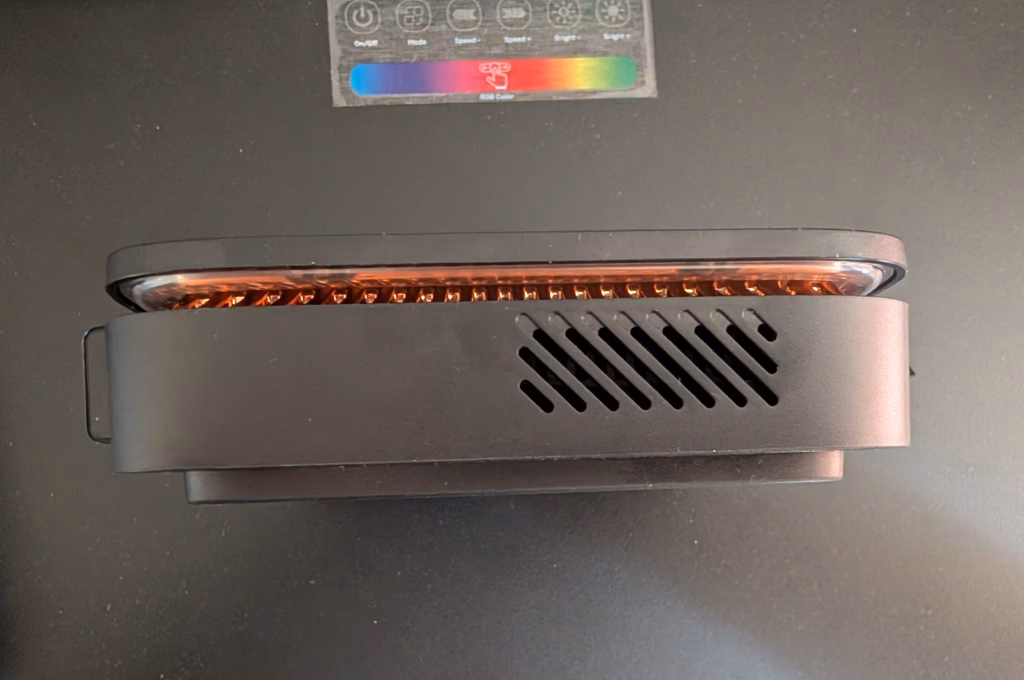 Physically, the NiPoGi AK1PLUS follows the typical mini PC form factor, being compact enough to fit in the palm of a hand. Its dimensions make it smaller than a traditional DVD drive, which is ideal for space-constrained environments like small offices or home entertainment setups. The casing, available in a dark grey often described as black, has a functional rather than premium appearance. Ventilation is provided through a side panel that also features an RGB status indicator, lighting up blue when active, amber in standby, and red during boot or power-off states. While this can be useful in low-light conditions, the light is less visible in brighter settings.