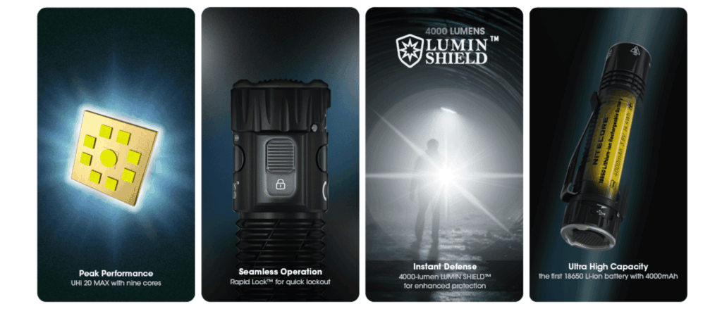 With LUMIN SHIELD, you hold down the tail button fully, and this will turn on all 9 LED cores at maximum brightness to create a 4000-lumen broad light wall, which Nitcore describe as being akin to a shield for personal defence, offering an unparalleled experience in self-protection.