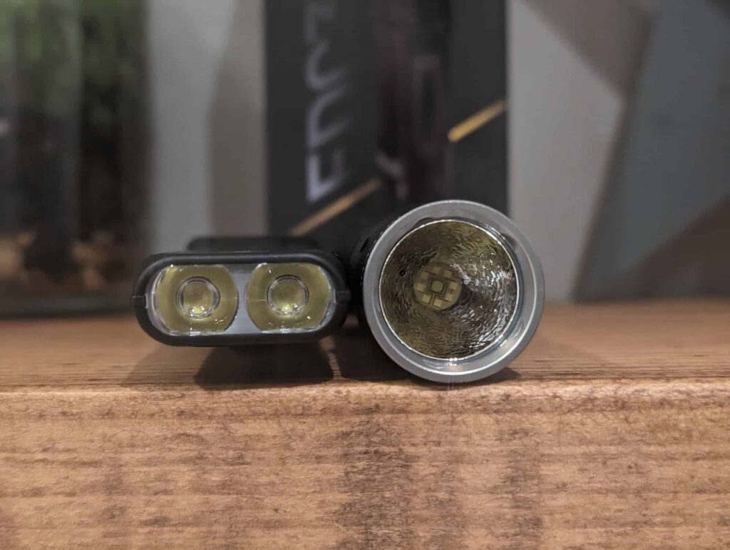 You can easily see the differences with the LEDs when pointing the light at a wall. You have an intense bright spot in the centre with a softer light circling it. This design gives you a good combination of light spread and throw distance.
