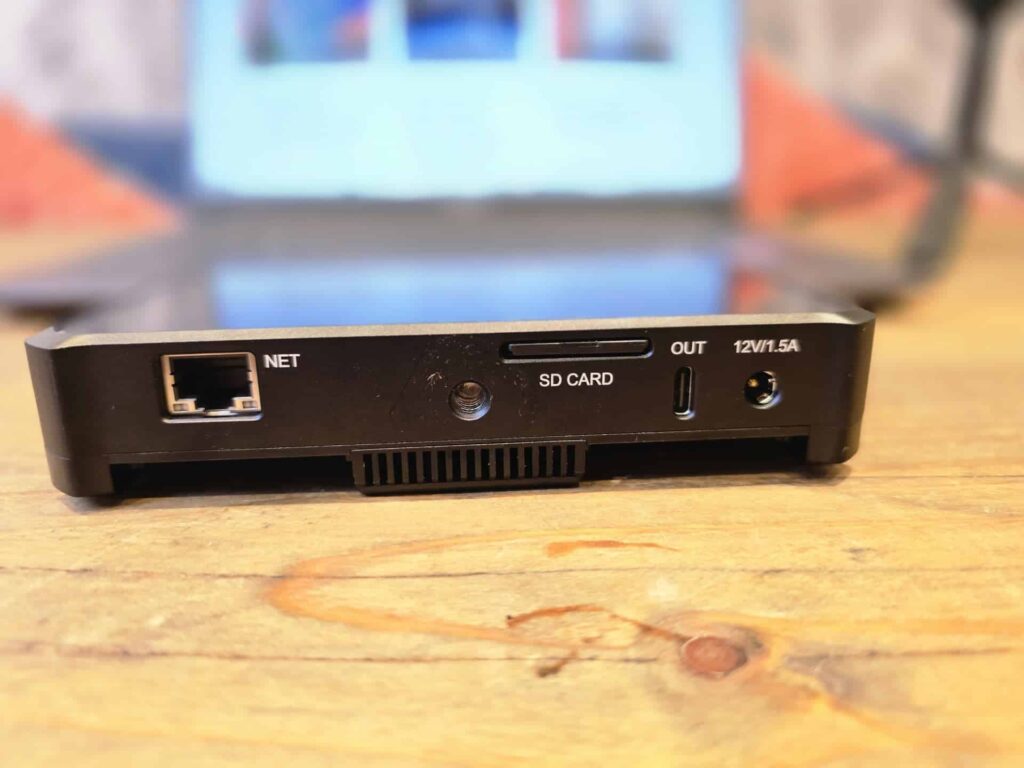 On the base are a Gigabit Ethernet port, SD card slot, USB-C output and DC input.