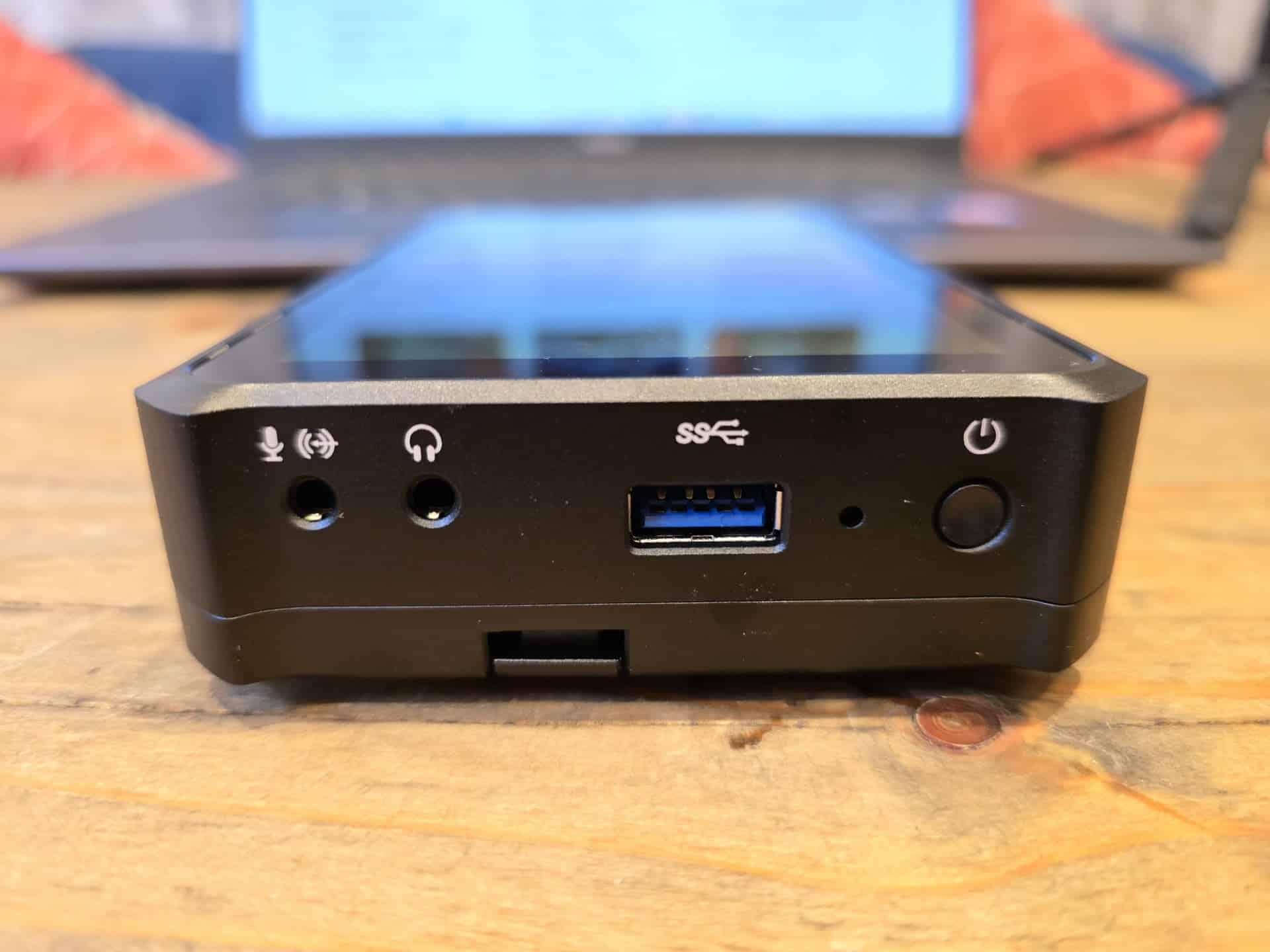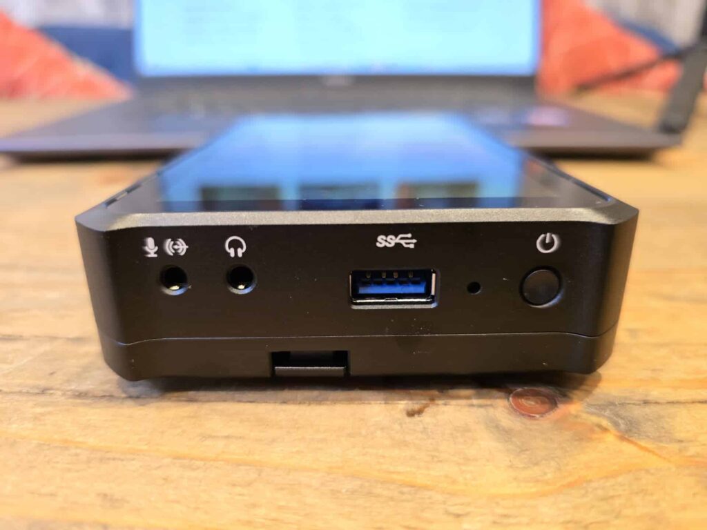 On the right is a single USB-A 3.0 port, a 3.5mm headphone jack and a 3.5mm microphone jack, and then the power button.
