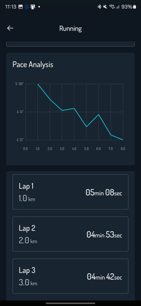 The data you get back from the app is basic but fine for most people. It is just the important stuff like your route, distance, pace, pace analysis, heart rate analysis, then steps and calories. So no advanced running analysis like ground contact time, symmetry/gait, VO2 max or training status.