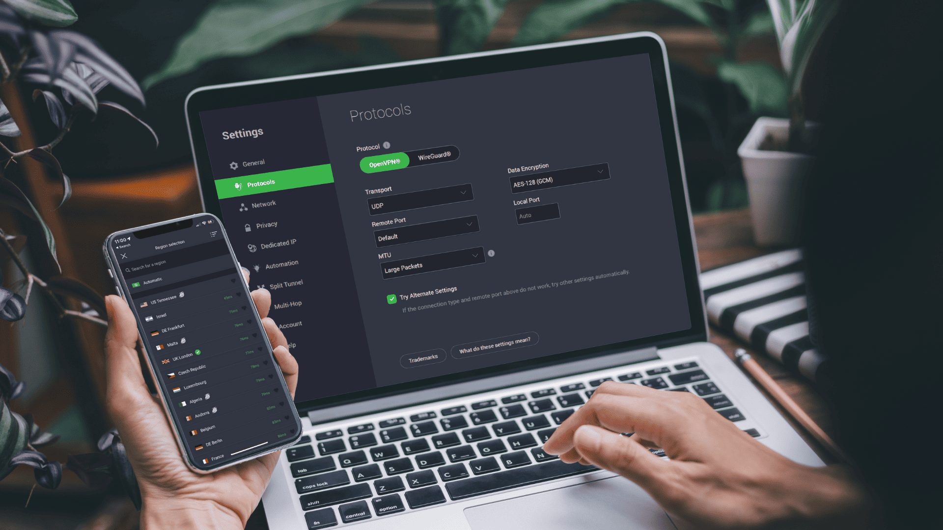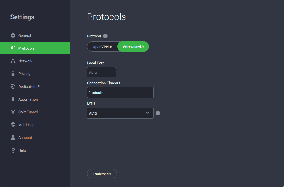 The Windows and Android apps both have several settings to make the VPN work the way you want. The main setting I’d recommend changing is switching from OpenVPN to WireGuard if it is not already enabled, as this will maximise the throughput you see.