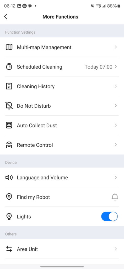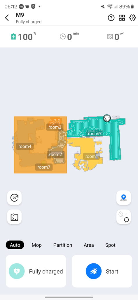The Proscenic app is well-designed and easy to navigate. The status screen shows the map with cleaning history, next clean, accessories status and the robots current location.