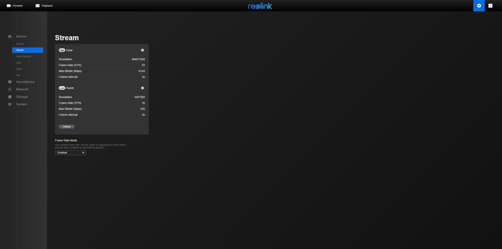 | Frame Rate | Main stream: 2fps – 25fps (default: 25fps); Sub stream: 4fps – 15fps (default: 10fps) |