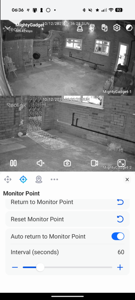 One quirk I discovered is that the monitor point – the position the camera returns to after recording motion – is not in the motion detection settings. You need to view the live feed, click the target icon, and set it manually. This is not immediately obvious and caught me out initially.