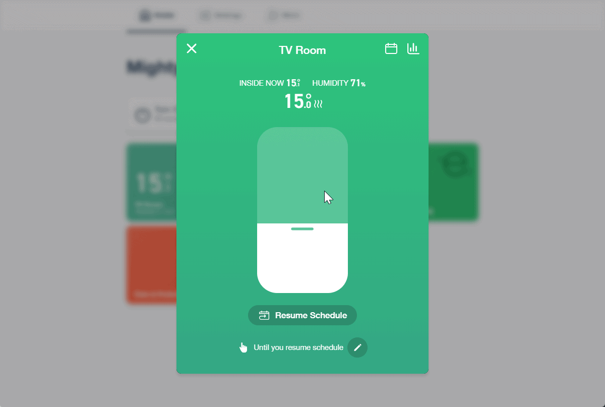 Similar to Genius Hub, you can manually control the heating for the room. By default, it will heat to the select temperature until the next schedule change, but you can adjust it to any time you want.
