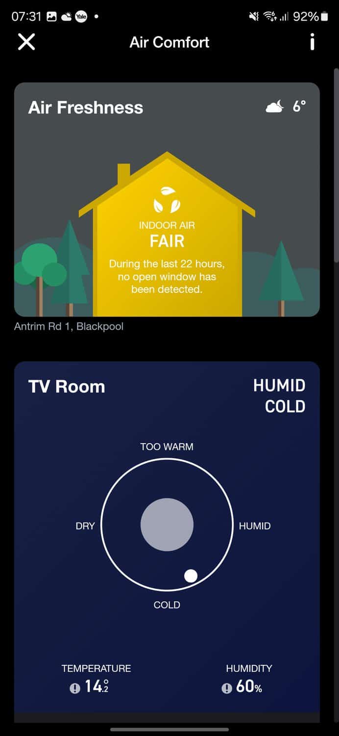 While a useful prompt, Air Comfort does rely on the thermostat’s built-in sensors which provide only a rough estimate of conditions in a single room. More advanced air quality monitoring would require additional dedicated sensors.