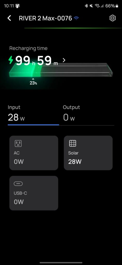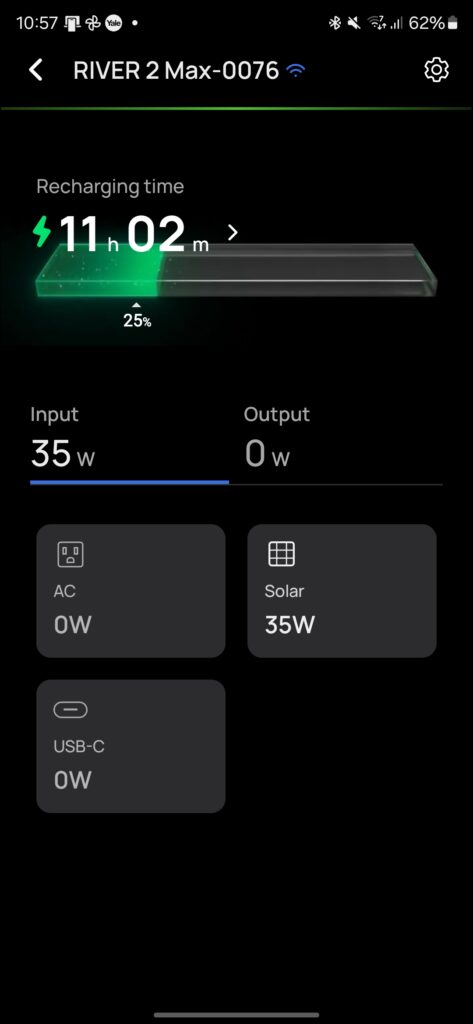 When I brought it in at 6:30 pm, EcoFlow had charged 64%.