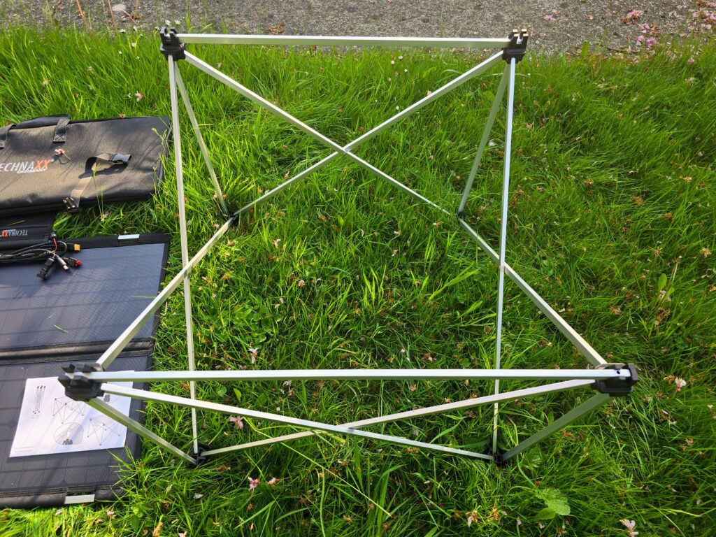 I thought assembling the frame would be more work, but the legs and frame are all connected, and you just unfold it and then slot in the four legs and two cross beams. The solar panel also slots into the groves of the frame.