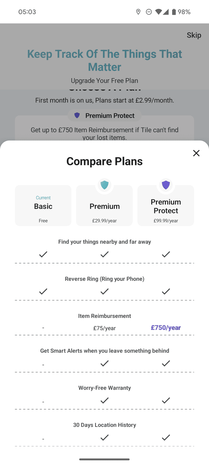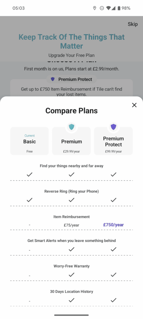 The premium plans have some features that justify the cost. This is mainly the item reimbursement, where you can get up to £75 a year or £750 a year for things that get lost because Tile can’t find them. You have to register the item and the Tile needs to have a functional battery. The item also has to have been registered for at least 30 days.