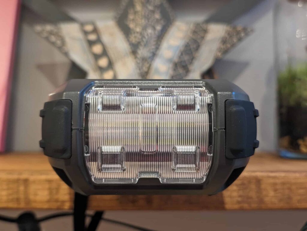 An integrated 400 lumen LED flashlight includes multiple modes: full strength, 50% brightness, SOS signalling, and flashing strobe. The adjustable stand allows tilting the flashlight horizontally or vertically.