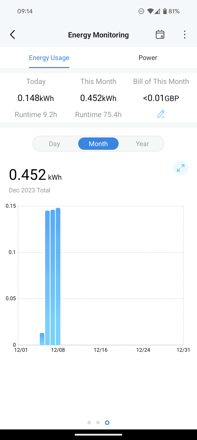 You can view the current run time, energy usage for the day and current power. Then, under the show more section, you can view a graph of power usage either for the current day, month or year.