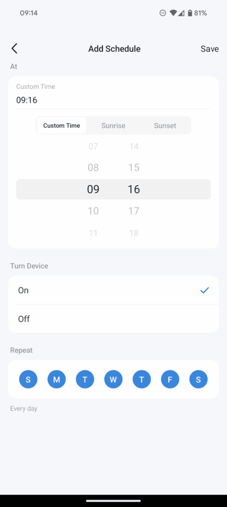 For scheduling, you have all the normal features with the option for multiple time-based schedules with on/off as well as sunrise and sunset options.