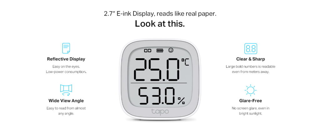 - It has a 2.7-inch e-ink display that shows the current temperature and humidity levels. It also indicates the comfort level using facial expressions, along with the battery condition and WiFi signal strength.