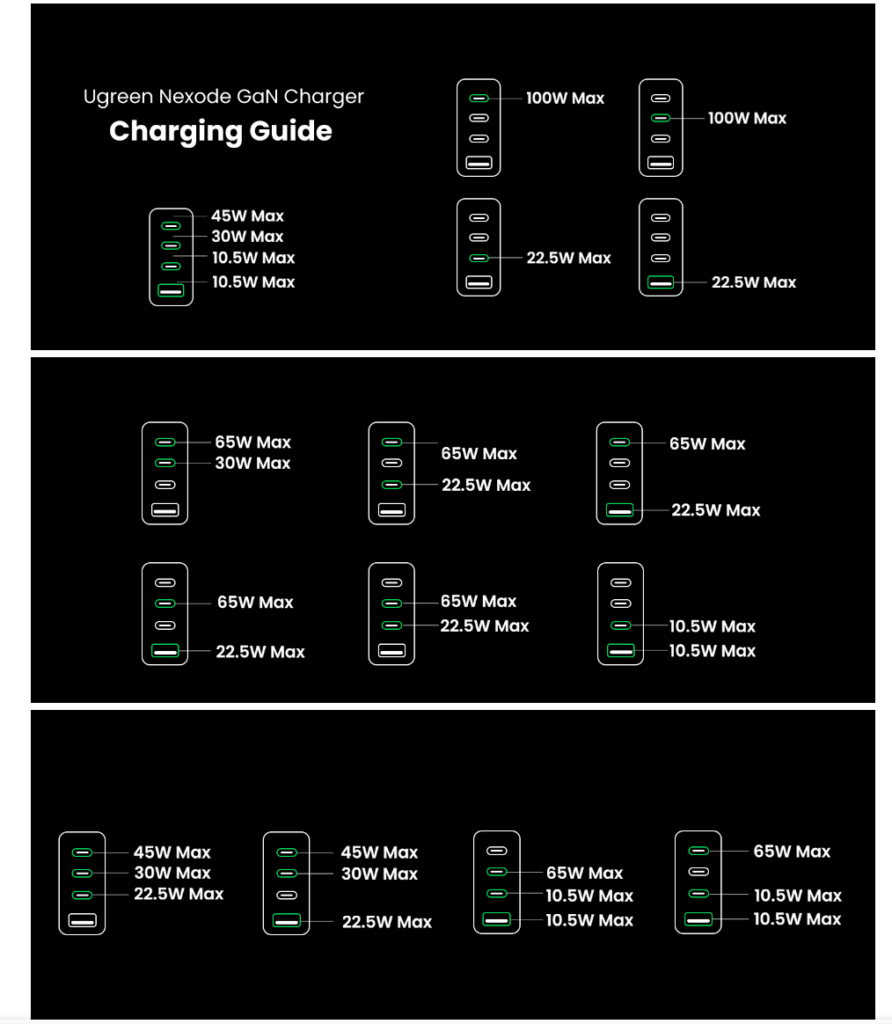 - USB-C 1, USB-C 2, and USB-A: 45W Max + 30W Max + 22.5W Max