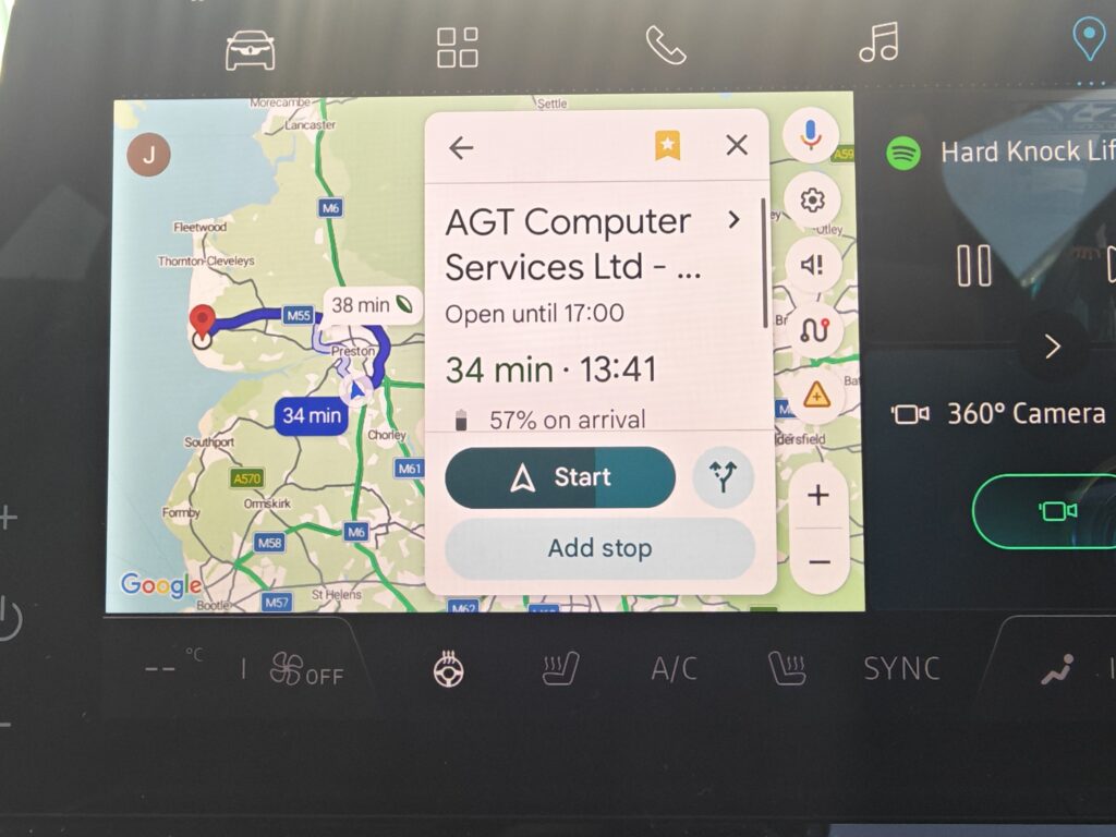 This deserves its own section because it has been genuinely useful. When using native Google Maps navigation, the car integrates battery data with the route to provide estimated charge levels at your destination and for the return journey. On longer routes where charging would be required, it will plot stops at compatible charge points intelligently.