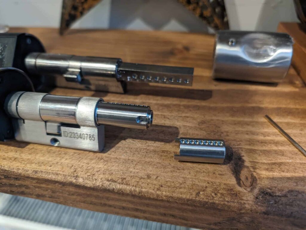 With this lock, there is an additional metal section that allows you to extend the width of the cylinder, which I needed to use with my door.
