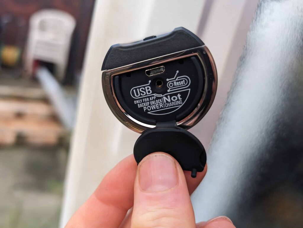 Pulling the rubber tab down, where the QR code is reveals a reset hole and a mircoUSB port for emergency power. I have modern electronics using mircoUSB, but in this case, you should rarely need to use it.