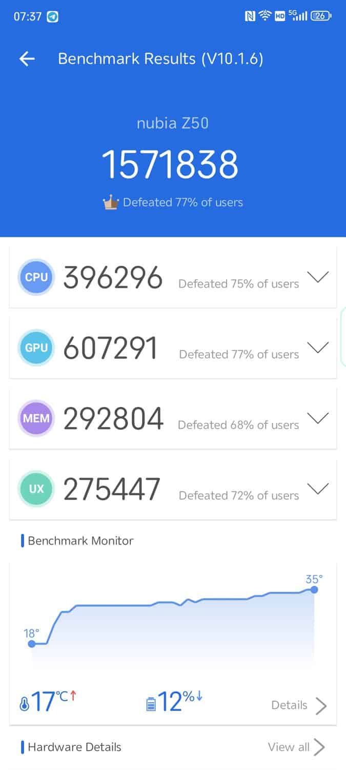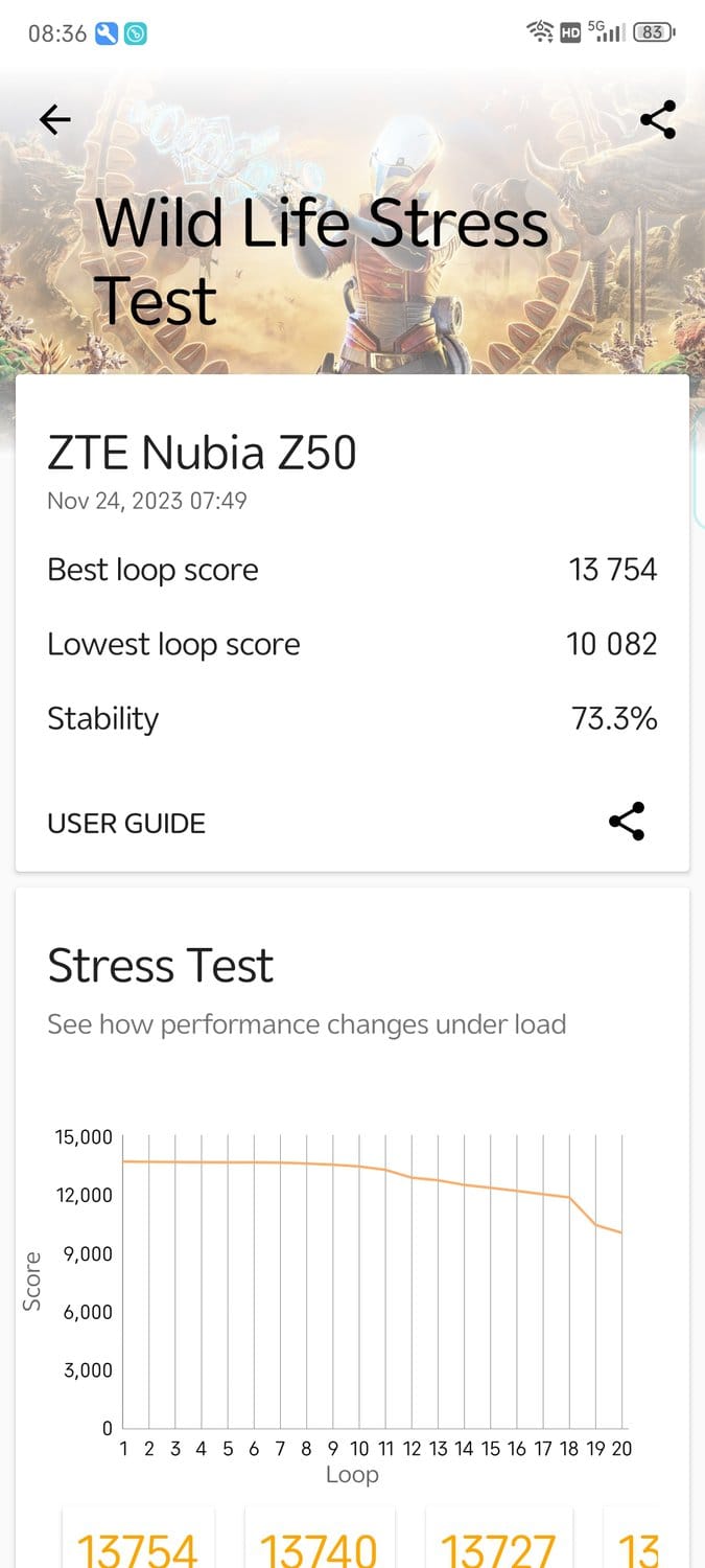ZTE/Nubia appears to favour performance over efficiency, and in the 3DMark Wildlife Stress Test, it achieved a score of 13754 for the best loop and 10082 for the lowest loop, giving it a stability of 73.3%. This is far better than the Honor Magic5 Pro, but the caveat is the temperature whet form 21° to 55°, which is significantly higher than most normal phones. You’d typically see 44° as the maximum temperature.